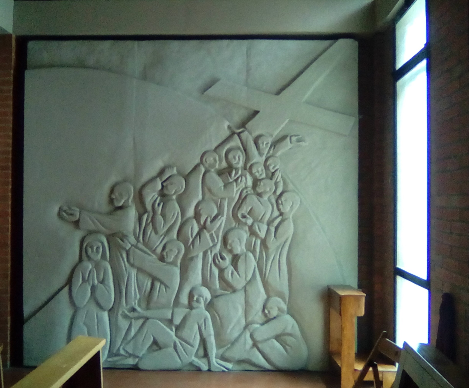 Una raffigurazione sintetica, silente, statica, in cui poche linee a rilievo su di un anonimo fondo in cemento, racchiudono tutta la l'intensità della narrazione evangelica, con il suo dramma, trafigge l'occhio di chi osserva e pian piano, coglie i dettagli, coglie il lento movimento dei personaggi che emergono, poco a poco, dalle pieghe scolpite nella cruda materia; personaggi senza volto, anonimi come coloro che prendono su di sé la propria croce e s'incamminano per le vie del mondo.